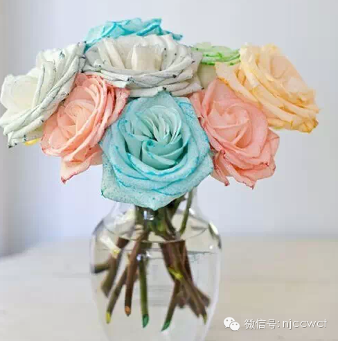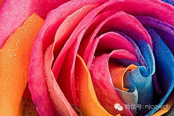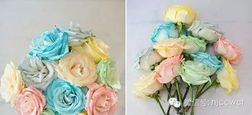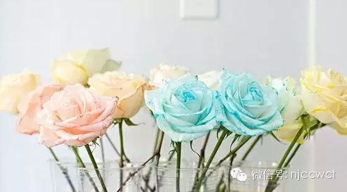 3、 若你想尝试轧染效果,可以将根茎切成两半,然后把两端分别放在不同的颜色杯里。你可以将根分成三份或四份,但这次我们只分了两份。 4、 耐心等待,你慢慢会发现花朵的变化。 成果图如下: 顺便科普一下:其实市面上绝大多数彩色玫瑰都是人工染色而成,最著名的就是“蓝色妖姬”——它是花中新贵,妖艳迷人,寓意相守是一种承诺。